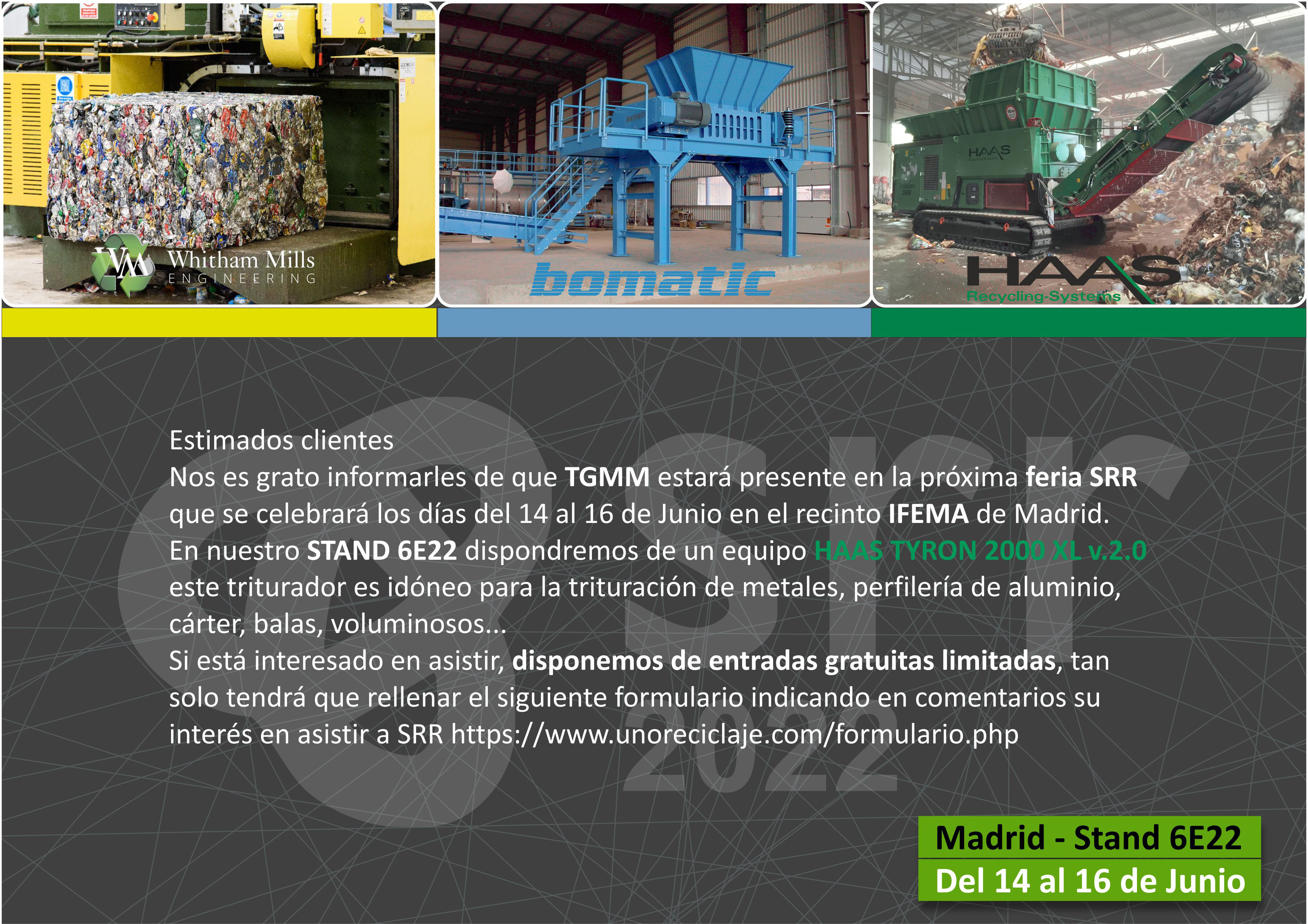 Nos es grato informarles de que TGMM – unoreciclaje.com estará presente en la próxima feria SRR que se celebrará los días del 14 al 16 de Junio en el recinto IFEMA de Madrid ( España ).