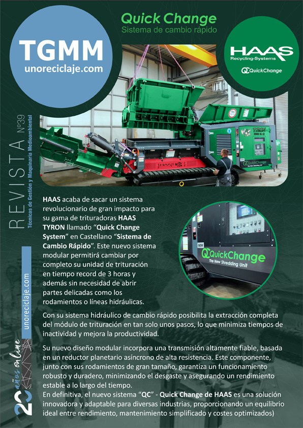Ya disponible la última revista de TGMM número 39 con las novedades más destacadas, incluyendo las nuevas trituradoras HAAS TYRON con su sistema revolucionario llamado “Quick Change System” ( Sistema de cambio rápido ). Este nuevo sistema modular permitirá cambiar por completo su unidad de trituración en tiempo record.